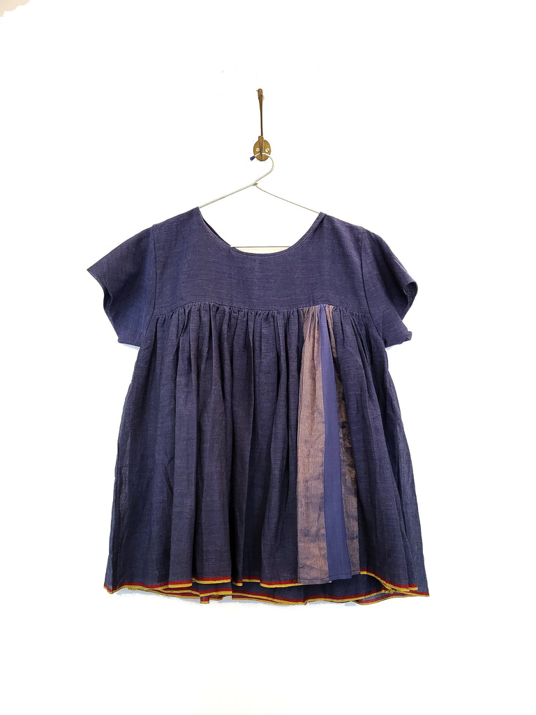 Handwoven cotton kedia top in soft mulmul cotton. With a gathered yoke and zari panel / kalli detail. We love the contrast selvedge hemline
