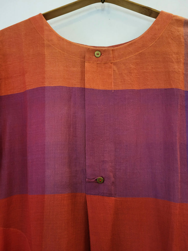 Kokila Kurta in signature woven checks from our famed Agomon collection in soft handwoven cotton. Brass button detail . Woven Zari detail in dull gold, along the back