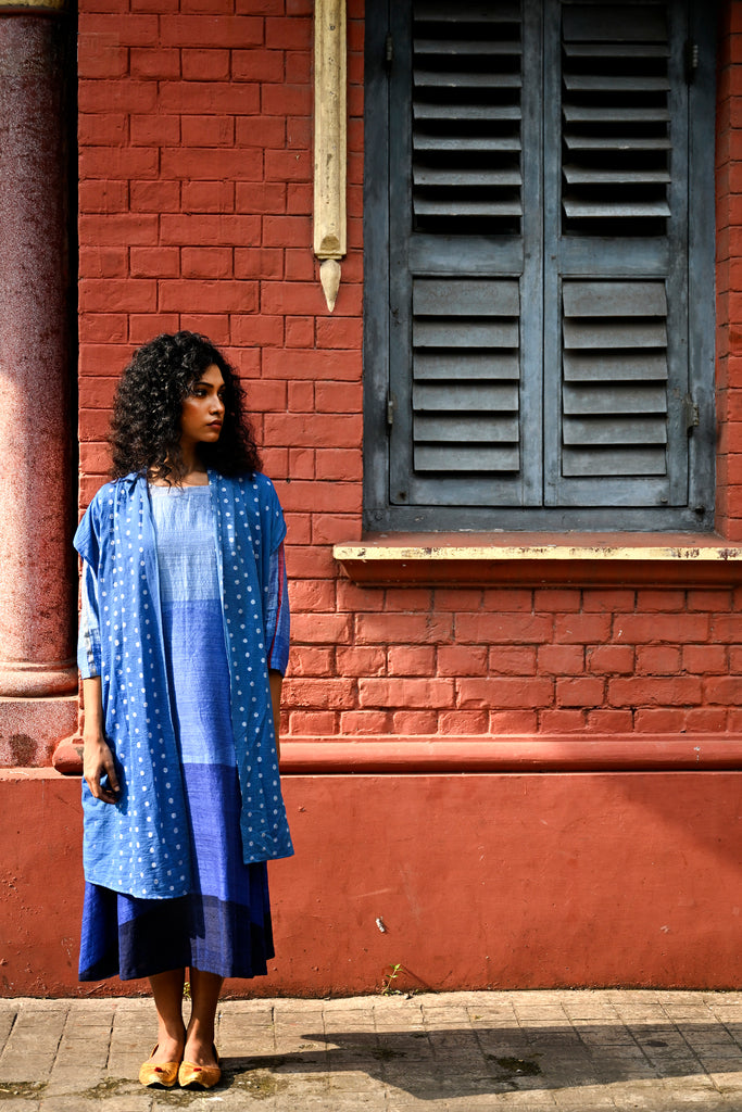 Sarbajaya Jatra cape is a travel cape. A handwoven overlay cape in shades of blue cotton woven with jamdani buti motifs in ivory . Here it is styled over our Woven Circle dress , which is priced separately.