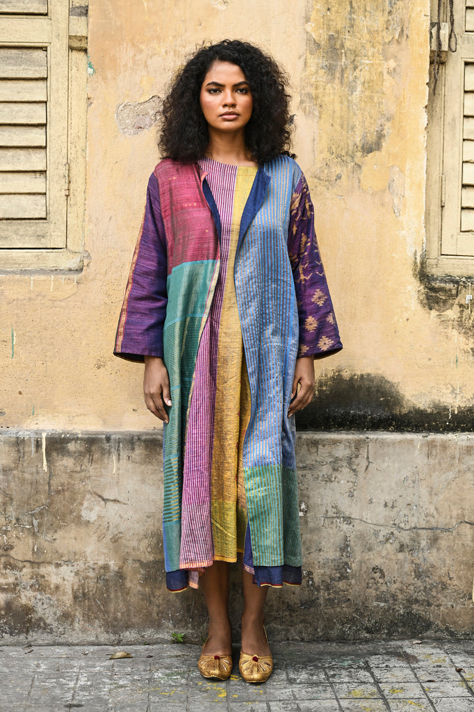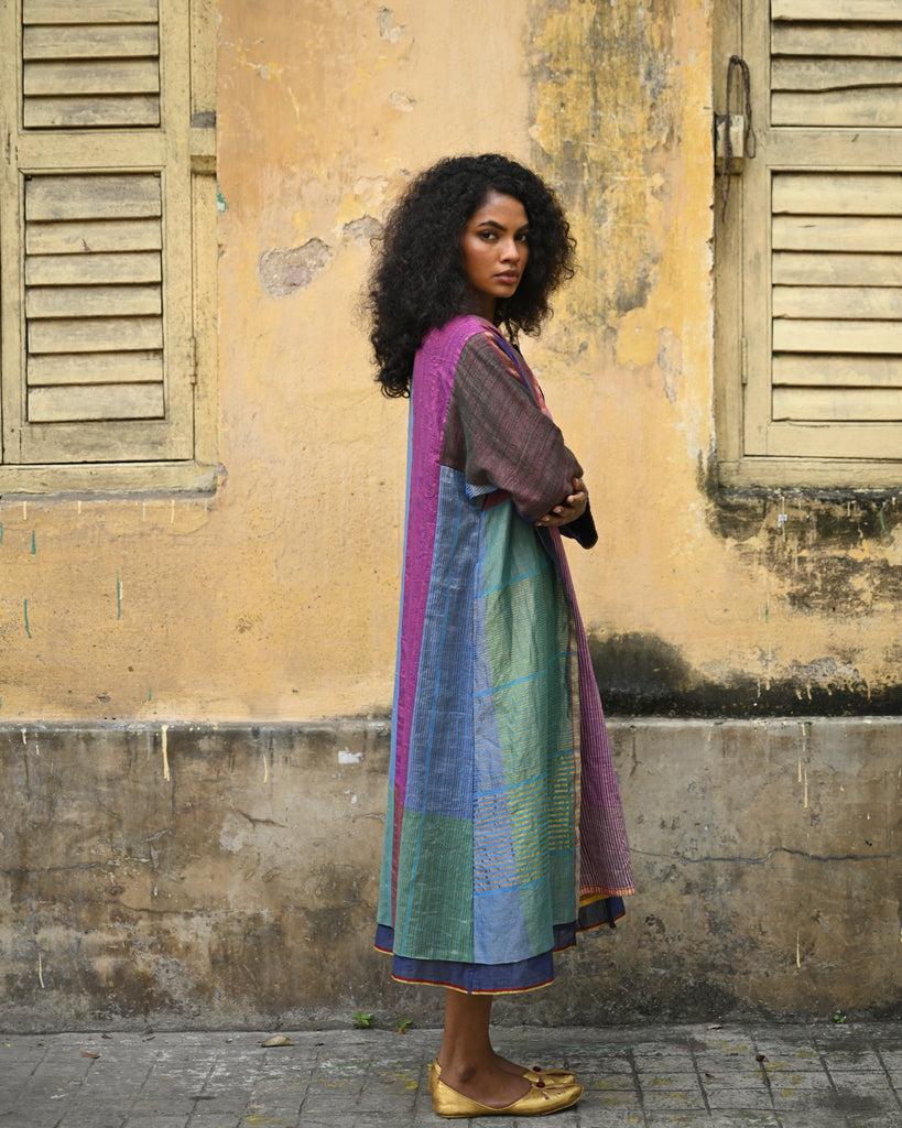 Our statement piece woven in handwoven silk matka, this Tree of Life cape is woven in continuous colour blocks of aqua - burgandy - sea green and gold zari. A cluster of woven jamdani 'tree' in placed along the sleeves , woven in extra weft jamdani.
