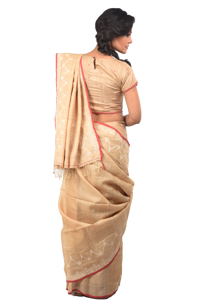 A classic saree in natural tassar with our signature jamdani border 'Kajol Paar' running along either edges, in ivory. The selvedge of the saree is in a contrast red. This is an organic variety of silk, and we have used the natural available shade of yarn without the use of any dyestuff.